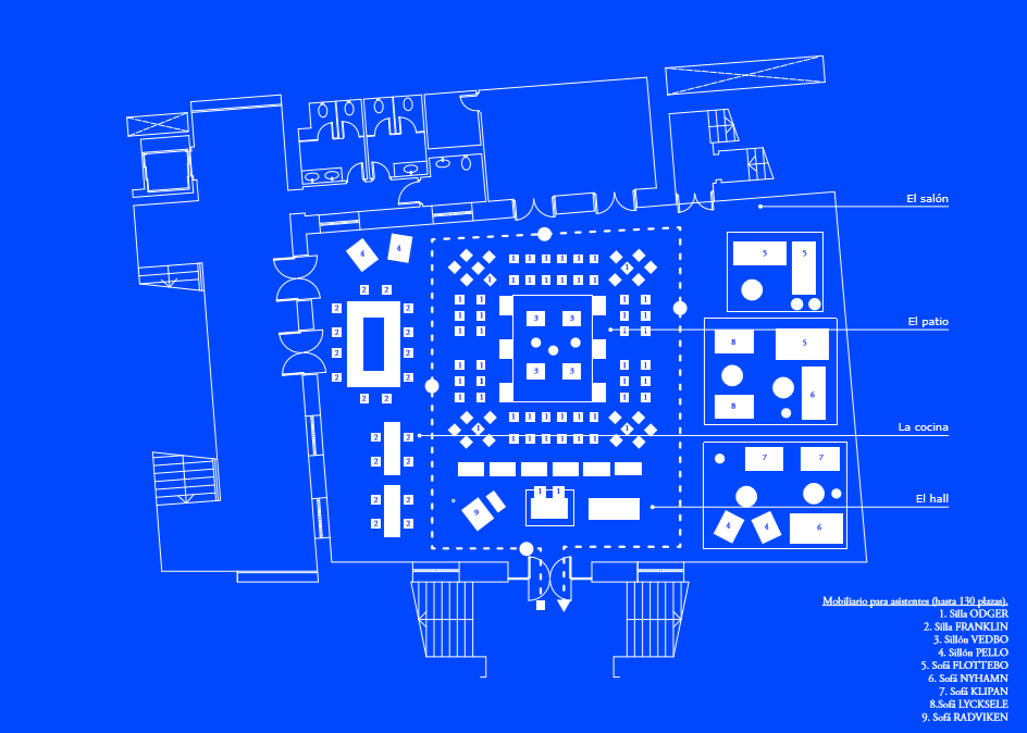 For this, not only a spatial and furniture design is proposed, but the development of a choreography that allows users to feel “at home”. Therefore, it is proposed, to begin with, a division of the courtyard of the Casa Encendida in different areas that would correspond to different areas that we could find a home: the hall, the kitchen, the patio or the living room. Distributed as if it were an exhibition space, and with clearly differentiated aspects, all have a single function, serve as a platform and observation points for conferences, and subsequently after small reconfigurations be the same for workshops.